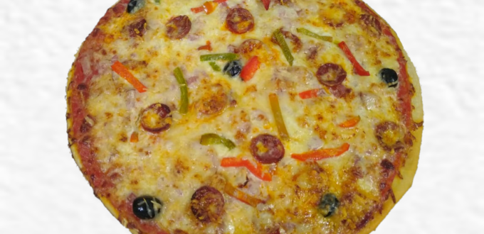 Find also the chef’s pizza. Ingrédient : Tomato, cheese, ham, lardons (bacon), chorizo (pork sausage), fresh cream, peppers, olives, onions.